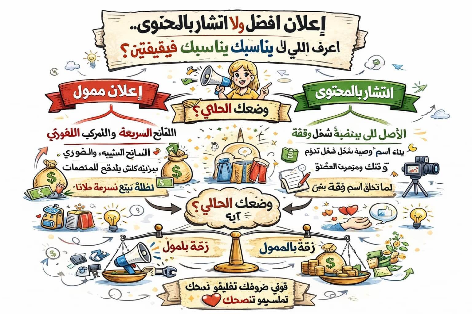 “أصرف قرشين في إعلان ممول والمبيعات تشتغل فوراً، ولا أتعب نفسي وأصور فيديوهات وأكتب بوستات (محتوى) وأستنى الرزق يجي بالهداوة؟”.بصفتي أختك سماسيمو، وبحكم خبرتنا في mtagir.com، هقولك إن مفيش إجابة واحدة تنفع للكل، السر كله في كلمة واحدة: “المرحلة”. النهاردة هنعرفك إيه اللي يناسب ظروفك وميزانيتك دلوقتي عشان م ترميش فلوسك في الأرض وم تضيعش مجهودك عالفاضي.