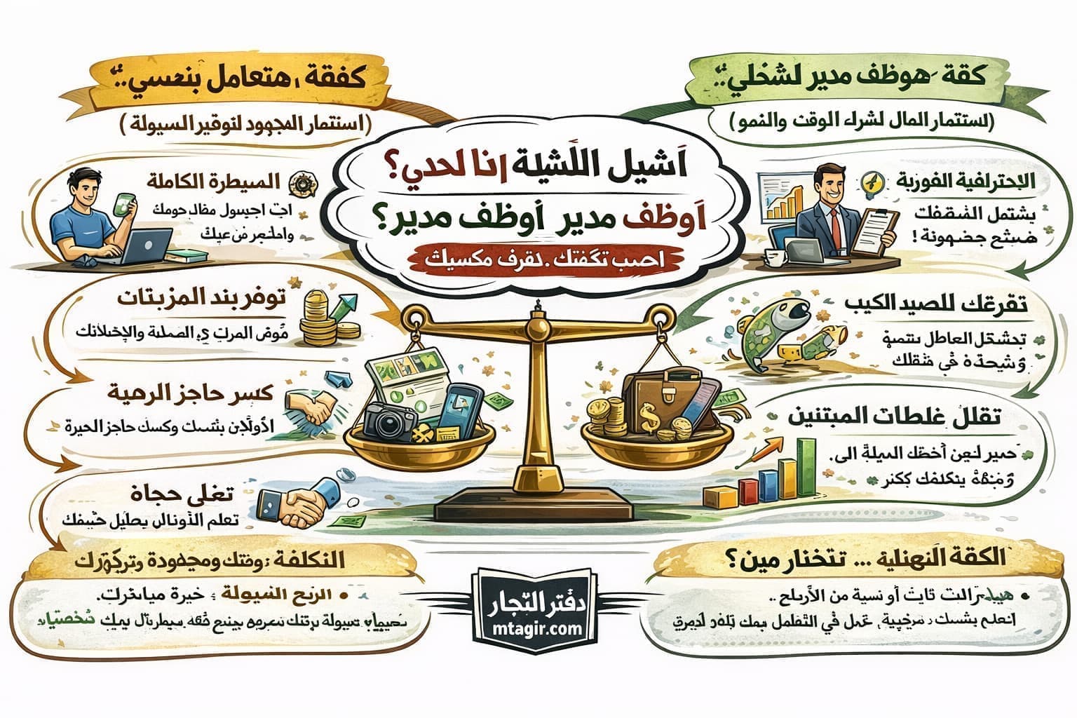 التجارة مش بس بيع وشرا، التجارة “نظرة مستقبلية”. سواء قررت تشيل الشيلة لوحدك أو تجيب مدير يسندك، المهم إنك متوقفش مكانك. الأونلاين بحر كبير، والشاطر هو اللي بيعرف يوزن مركبه صح.